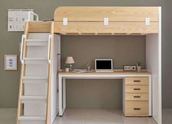 Giống như tên gọi bàn học kết hợp giường tầng thông minh kết hợp bàn học là giường ngủ loại nhỏ và phía dưới là bàn học. Đây là một giải pháp cho những phòng có diện tích nhỏ, không đủ không gian để kê bàn học cho bé. Bàn học kết hợp giường tầng giúp tiết kiệm diện tích rất nhiều. Vừa mang lại một không gian học tập, làm việc lại vừa là nơi có thể ngủ.