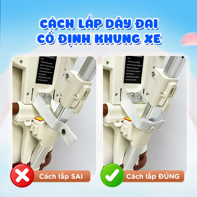 – Đệm lót, mái che có thể tháo rời giặt tay– Khi bung xe ra sau khi gấp gọn, khách hàng lưu ý cài chốt cố định đệm ngồi vào khung xe (đảm bảo khớp đã vào) trước khi cho bé sử dụng. Điều này thực sự cần thiết đến sự an toàn của bé nên quý khách hàng đặc biệt chú ý.– Cài dây cố định khung xe để gia tăng độ an toàn