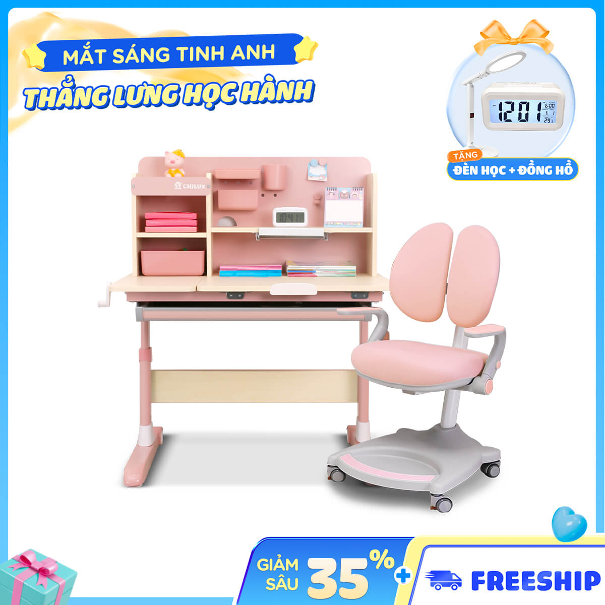 BÀN HỌC THÔNG MINH CHILUX SMART D (MÀU HỒNG – DÀI 1M + GHẾ G19)