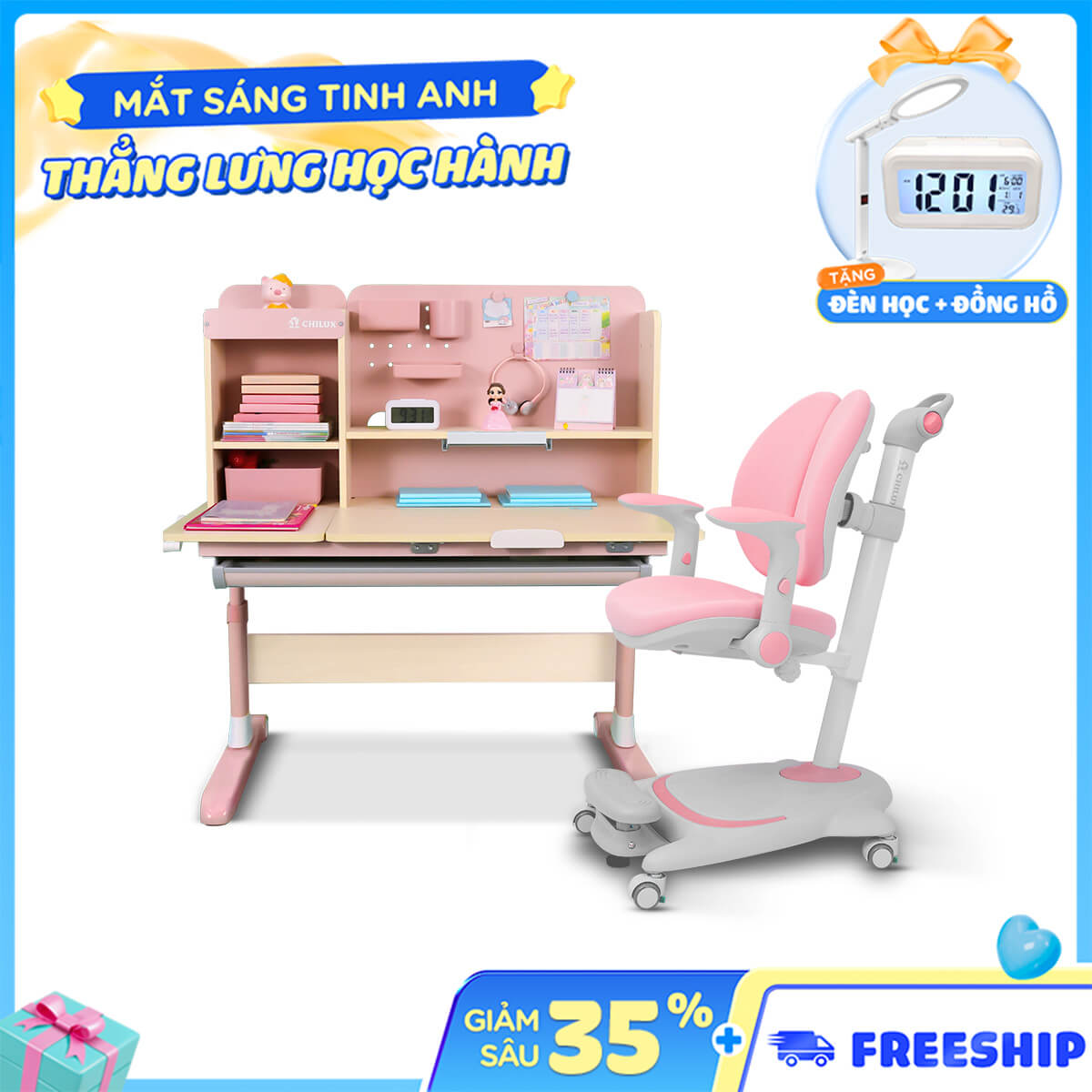 BÀN HỌC THÔNG MINH CHILUX SMART D (MÀU HỒNG – DÀI 1M2 + GHẾ G20)