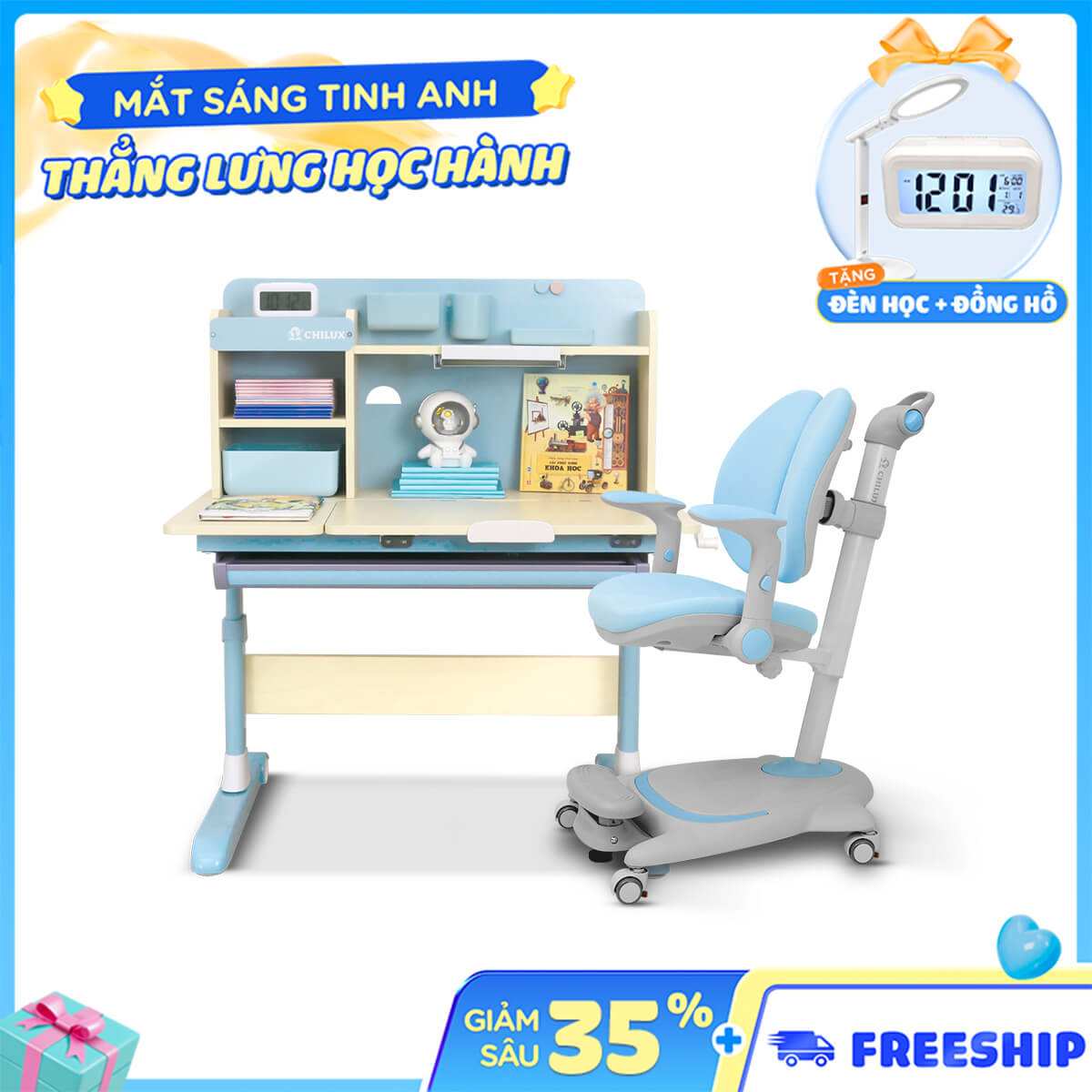 BÀN HỌC THÔNG MINH CHILUX SMART D (MÀU XANH – DÀI 1M + GHẾ G20)
