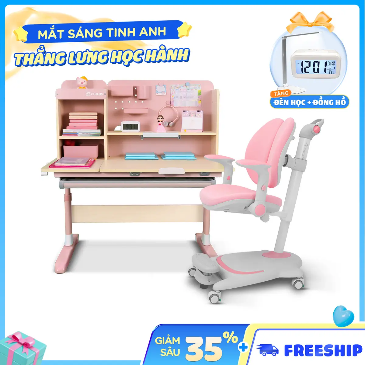 nhóc nhà e tới tuổi đi học nên tìm cái bàn tốt tốt. nhớ tới a họ nó dùng bàn của chilux có chống gù chông cận, êm. nên e tranh thủ ghé qua showroom chốt luôn. mua ngay đợt giảm giá, còn được freeship.