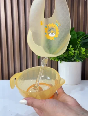 - Chén ăn có tay cầm và miệng rót nhỏ, tránh trượt tay và đổ thức ăn ra ngoài