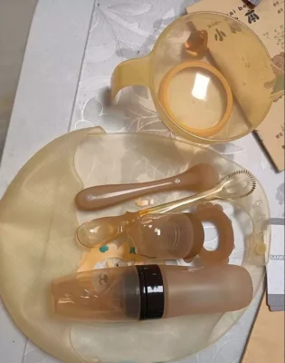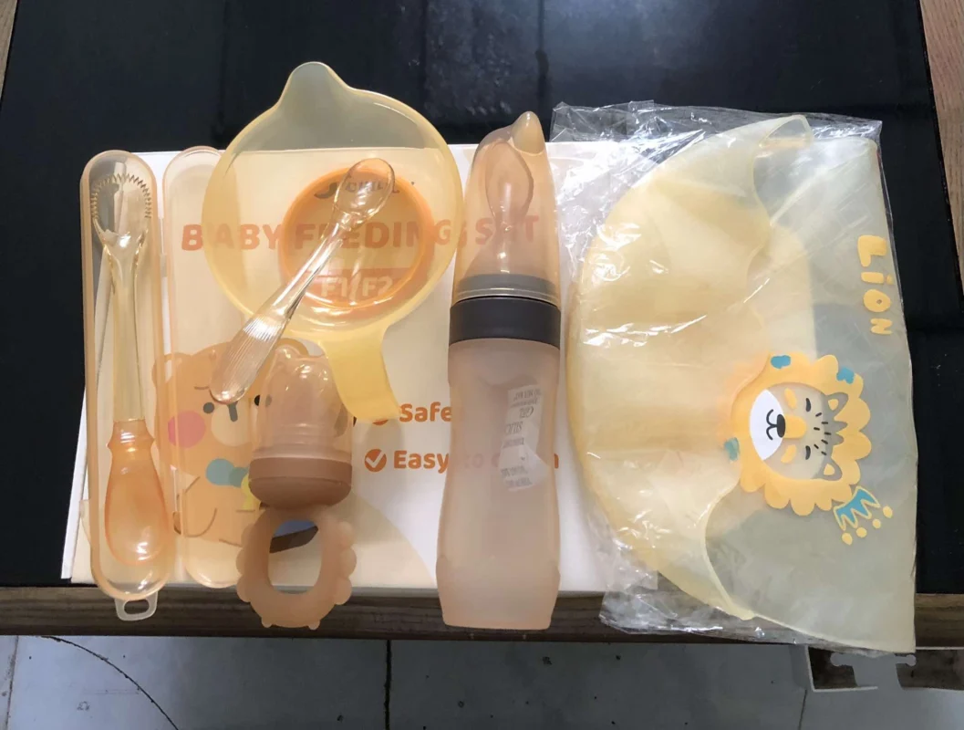- Combo 6 món gồm: chén nhựa, muỗng ăn, bình đựng cháo, túi tập nhai, yếm ăn dặm, muỗng 2 đầu