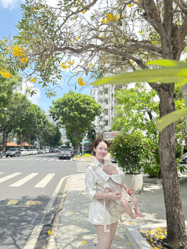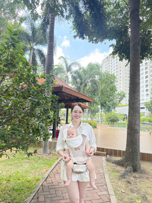 sau 2 cái địu trước cứng với đau vai thì trộm vía cái địu thứ 3 này bé chịu ngồi ròi, chắc do thoáng mát, đỡ bí nên Em mới hợp tác